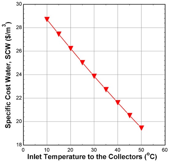 Effect of inlet water temperature to the collectors on SCW. The triangles represent the specific cost water values under the variation of collectors’ temperature.