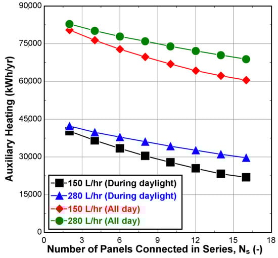 Auxiliary heating was utilized in the proposed system in case the solar energy gained by the collector is not sufficient to raise the brackish water to a predetermined temperature. Figure 9 illustrates the annual auxiliary heating energy required as a function of the number of panels connected in series in two different situations. The bottom two lines (black square and blue triangle) depict the annual auxiliary during daylight for two different flow rates. In this case, the DCMD was only operating during sunlight. The other two lines (green circle and red diamond) represent the annual auxiliary heating requirement when continuous water production is required. It is clear from this figure a continuous water production increases the annual auxiliary heating for a given number of panels by 49%.