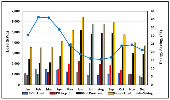 Monthly power generation of PVT, load demand, and exported and imported grid power to the house, and overall energy saving.