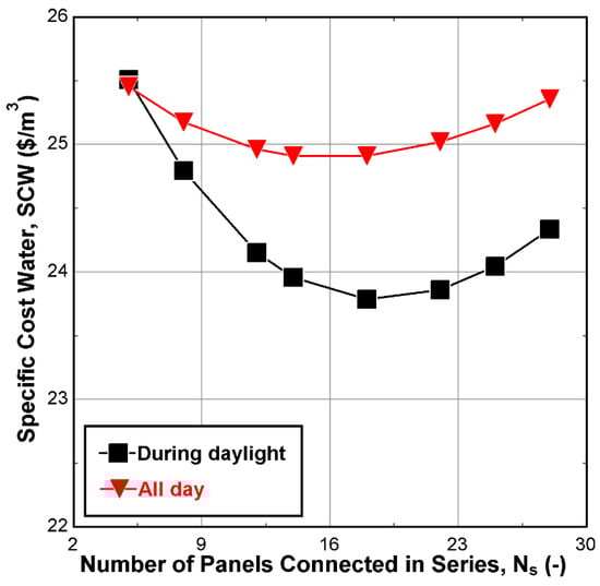 For continuous water production, the proposed system costs 5% more for each cubic meter. This is illustrated in Figure 11. This figure shows the SCW of water as a function of the panels connected in series. It is clear from this figure that the best price occurs at Ns = 18. At lower panels connect in series, the SCW is high because more auxiliary heating is used to rise the water temperature to 70 °C. Conversely, increasing the number of panels beyond 18 rises the SCW due to the increase in operating and insulation cost.