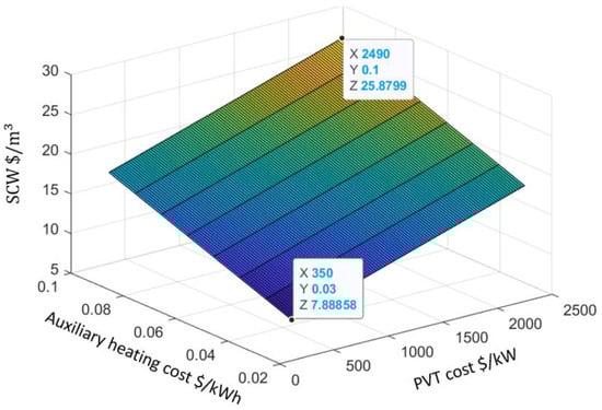 The capital and investment costs of the proposed system have a significant impact on the SCW. The impact of the PVT system’s capital cost and the cost of auxiliary heating on the SCW was investigated using a sensitivity analysis, as shown in Figure 13. As mentioned previously, auxiliary heating is used to ensure the hot feed water to the DCMD unit to not fall below 70 °C. It is clear from Figure 13 that the SCW is proportional to both PVT capital price and the auxiliary heating cost. It is worth noting that the average price for the PVT is 1800 $/kW. With current market price, the SCW for the proposed system is 23.6 . In addition, previous studies show that the cost of desalinated water (SCW) varies from 15 to 18.34 $/m3 [16,17]. These studies utilized membrane technology powered by solar energy on a small scale. The simulated results obtained from the proposed system are comparative to previous studies where the where SCW is around 23.6 $/.