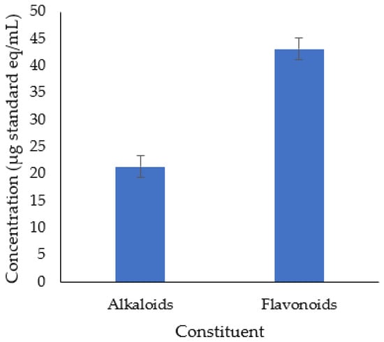 In this study, we exhibited an ethanolic extraction of A. muricata leaves. Our findings denoted that the ethanol extract of A. muricata leaf has concentration of alkaloids and flavonoids were 21.37 ± 3.6 µg atropine eq/mL and 43.15 ± 2.04 µg quercetin eq/mL, respectively (Figure 1). These results amplify the HPLC-ESI-MS/MS analysis, which identified various alkaloid and flavonoid compounds in this plant extract (Figure 2 and Table 2). Some common bioactive compounds were shown in the ethanolic extract, such as anonaine, chlorogenic acid, coclaurine, isolaureline, isoquercetin, kaempferol, loliolide, norcorydine, quercetin, reticuline, rutin, and xylopine (Figure 3).