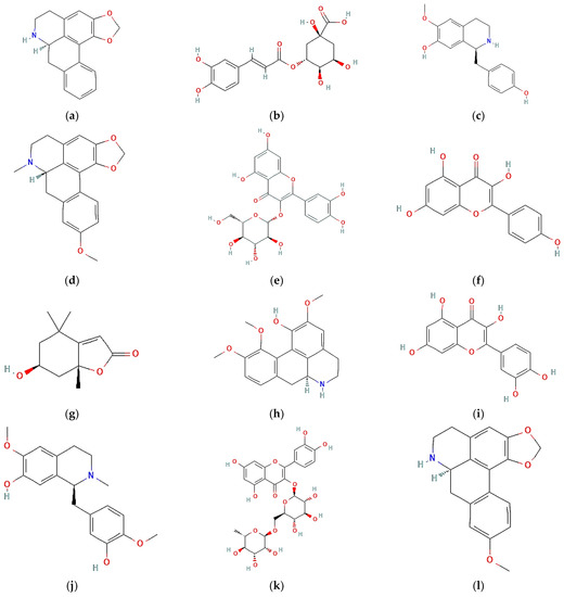 Bioactive compound structures found in A. muricata leaf ethanol extract: (a) anonaine; (b) chlorogenic acid; (c) coclaurine; (d) isolaureline; (e) isoquercetin; (f) kaempferol, (g) loliolide; (h) norcorydine; (i) quercetin; (j) reticuline; (k) rutin; (l) xylopine.