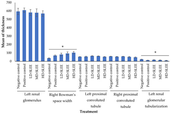 The one-way ANOVA test for the thickness of Bowman’s space width of right kidney had a p-value of 0.025 (p < 0.05). Furthermore, Bonferroni post hoc test was carried out, and there was a significant difference between the high-dose SLEE (HD-SLEE) group and the negative control group (Figure 2). Therefore, it was concluded that the mean of Bowman’s space width of right kidney in each group was significantly different.