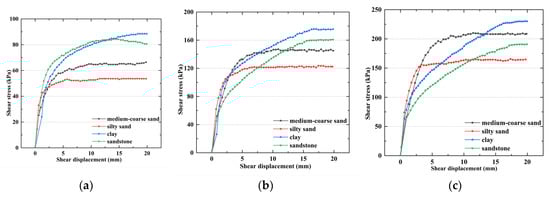 Shear stress–shear displacement curves of different soil specimens with 15% moisture contents: (a) normal stress: 100 kPa, (b) normal stress: 200 kPa, and (c) normal stress: 300 kPa.