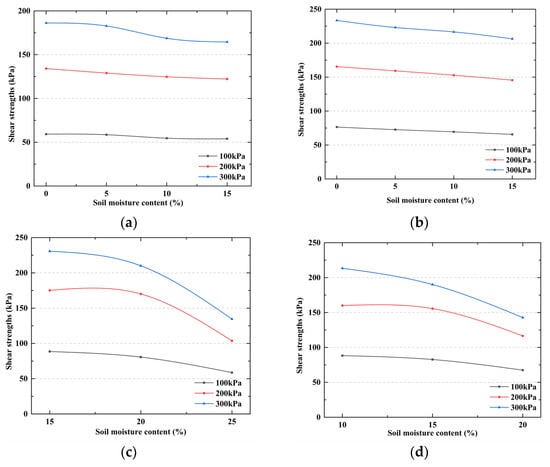 The critical values of the shear stress under the conditions of the different soil types, soil moisture contents, and normal stresses were taken as the interfacial shear strength, as shown in Figure 8. With the increase in the moisture content, the shear strengths of the different soil types decreased to varying degrees. The shear strength of the medium-coarse sand and silty sand decreased by 5–22 kPa, but the overall extent of the decrease was small. For the silt and sandstone, under the same normal stress, the interface was greatly affected by the moisture content. When the moisture content was at a low level, the shear strength of the interface decreased slightly with the increase in the moisture content. However, when the moisture content was above a certain threshold, the shear strength of the interface decreased rapidly, and the maximum decrease was 96 kPa. In addition, the shear strength of the silt and sandstone clayey soil interface was more sensitive to the soil moisture content.