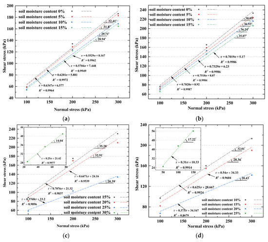 Figure 7 shows the results for different soil specimens with a moisture content of 15%. When the normal stress was 100 kPa, the maximum shear stresses of the different soil specimens in descending order were clay, sandstone, medium-coarse sand, and silty sand. The difference in the maximum shear stress between the clay and the sandstone was small; yet, as the normal stress increased, the difference gradually increased. This was mainly due to the formation of a thin layer of silt at the clayey soil–concrete interface under the action of the normal stress, which reduced the interfacial shear strength. In comparison, the sandstone had more evident water softening properties than the clayey soil. For the silty sand and medium-coarse sand, a water film formed at the interface due to water discharge. However, the water film had little effect on the shear stress of the interface. The shear stress of the silty sand was lower than that of the medium-coarse sand. This was because the particle size of the silty sand was small (0.25–0.5 mm), and compared with the medium-coarse sand, the silty sand particles could more easily fill the voids on the concrete surface, thereby reducing the interface friction coefficient. The particle sizes of the medium-coarse sand were evenly distributed in the range of 0.1–5 mm. The gaps between the particles and between the particles and the concrete surface resulted in an embedding effect, which improved the interfacial shear strength.