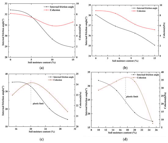 Variation of shear strength parameters of different interfaces with soil moisture content: (a) silty sand, (b) medium-coarse sand, (c) clay, and (d) sandstone.