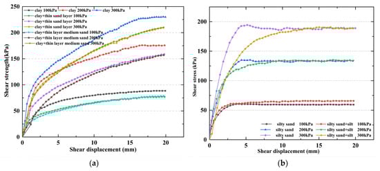 Effect of filling material on shear characteristics of soil–concrete interface: (a) clay filled with sandy soil and (b) silty sand filled with silt.