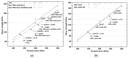 The relationship between the shear strength and the normal stress for the different soil–concrete interfaces was fitted (Figure 9) with the following equation: