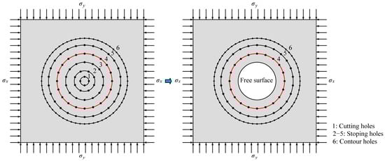 In this numerical study, a circular tunnel with a radius of 5.0 m is considered to be excavated in a homogeneous and isotropic rock medium. The rock medium suffers from horizontal in situ stress σx and vertical in situ stress σy. The circular tunnel is excavated by the millisecond-delay blasting technology with six rounds of blastholes, as presented in Figure 1. The cutting holes in the innermost round are first fired, followed by the stoping holes in the second to fifth rounds and the contour holes in the outermost round. The distances from each round of blastholes to the center of the tunnel are 0.5, 1.2, 2.2, 3.2, 4.2, and 5.0 m, respectively. In the present study, the stoping hole blasting in the fourth round is simulated. There are twenty blastholes with a spacing of 1.0 m in this round. The blastholes are 0.04 m in diameter and are fully filled with explosive columns of the same diameter. The twenty blastholes are considered to be fired simultaneously, regardless of detonator delay errors. Before blasting the stoping holes in the fourth round, the blastholes in the previous rounds have been detonated, and a new free surface has been created, as shown in Figure 1. In the numerical study, the new free surface aligns the connecting line of the blastholes in the third round without considering over-break or under-break caused by blasting.