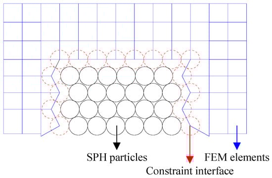 Combining the strengths of each of these two modeling methods, a coupled SPH-FEM approach is adopted in this study to address the rock fracture and seismic wave propagation caused by blasting in stressed rock masses. When using the coupled method, explosives and the rock surrounding blastholes are represented by SPH particles to accommodate large distortions and deformations. Outside the fractured zone, the rock is represented by FEM elements to realize the application of in situ stress on the model boundaries and improve the computational efficiency of seismic wave propagation. The coupled interactions between the SPH particles and the FEM elements are realized via a constraint interface [], as presented in Figure 2. In this way, the stress transmission and displacement coordination between the SPH particles and the FEM elements are achieved.