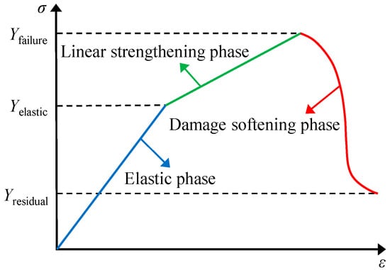 In the damage softening phase, a parameterized damage model driven by plastic strain governs the evolution of material damage. The damage variable D is defined as: