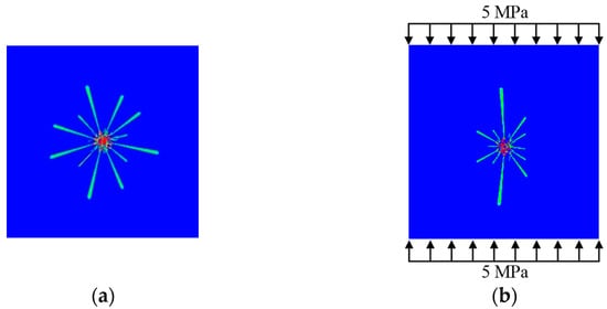 Numerical modeling of rock fracture caused by single-hole blasting: (a) without initial stress; (b) with a uniaxial stress of 5 MPa.
