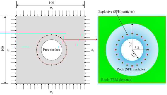 In dealing with the large deformation problem of rock blasting, the traditional FEM is prone to mesh distortion. It results in a significant reduction in computational accuracy and efficiency, and even sometimes, computations are unsustainable. The SPH modeling method is a meshless Lagrangian approach that treats materials as arbitrarily distributed particles. These particles carry material information such as position, mass, velocity, and energy. Then the behavior of materials can be obtained by tracking the trajectory and computing the dynamic equation of each particle []. Because the SPH approach is meshless and avoids mesh tangling, it is especially suitable for modeling the large deformation problem of rock blasting. This hydrodynamics method was originally proposed for modeling astrophysical problems with infinite boundaries. A major limitation of applying this method in other fields is that finite boundary conditions cannot be enforced []. Therefore, the pure SPH approach is powerless when applying in situ stress on the model boundaries for simulating the deep rock blasting. In addition, the SPH method is computationally expensive, and its computational efficiency is inferior to the FEM in handling small deformation issues such as seismic wave propagation.