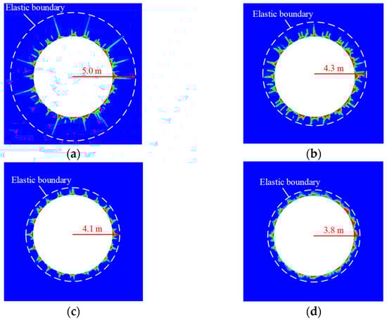 Distributions of the fractured zones caused by blasting under varied hydrostatic in situ stress levels: (a) σx = σy = 0 MPa; (b) σx = σy = 10 MPa; (c) σx = σy = 30 MPa; (d) σx = σy = 60 MPa.