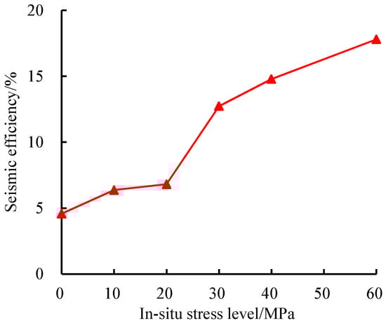 The rock mass beyond the crack tip is elastic. Therefore, the circle boundary, which takes the tunnel center as the center and takes the distance from the tunnel center to the tip of the longest crack as the radius, is treated as the outer boundary of the fractured zone, namely the elastic boundary. Extracting the velocity histories on the elastic boundary and substituting them into Equation (6) yields the blasting seismic energy on the elastic boundary. According to Equation (7), the blasting seismic efficiency η can be obtained. Figure 7 shows the blasting seismic efficiency variation with the in situ stress levels. Under σx = σy = 0 MPa, the seismic blasting efficiency is 4.6%, which means that only 4.6% of the explosive energy is converted into blasting seismic energy. This percentage agrees well with the average of the measurements by Sanchidrián et al. []. Under σx = σy = 60 MPa, a seismic efficiency of 17.8% is attained. The initial blasting seismic energy at this in situ stress level is about four times that of the case without in situ stress. Clearly, the initial blasting seismic energy increases significantly with increasing in situ stress levels. This indicates that compared to blasting in shallow rock masses, more seismic energy is generated in deep rock mass blasting. This is because with the increase in the in situ stress level, the extent of the fractured zone is reduced, and the explosive energy consumed in the rock fracture is accordingly reduced. Consequently, more explosive energy is converted into blasting seismic energy.