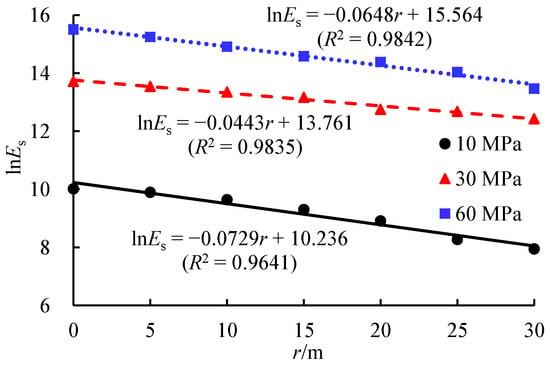 Figure 8 presents the seismic energy versus distance on a logarithmic plot. The attenuation index α of seismic energy can be acquired through linear regression of the scattered data pairs. In the linear regression, the slope of the best fit straight line represents the attenuation index α. In this figure, the symbol R2 denotes the squared correlation coefficient between the scattered data pairs and the best fit straight line. The squared correlation coefficients are all greater than 0.95. This indicates that the seismic energy attenuation with distance does follow the exponential function described in Equation (14). Figure 8 only shows the regression analysis for the in situ stress conditions σx = σy = 10, 30, and 60 MPa. The attenuation indexes obtained by the regression analysis for the other in situ stress conditions are summarized in Table 2. As the hydrostatic in situ stress level increases from 0 to 30 Mpa, the attenuation index of seismic energy decreases from 0.0940 to 0.0443. The blasting seismic energy attenuation with distance becomes slower with increasing in situ stress levels. However, when the stress continues to increase from 30 to 60 Mpa, the attenuation index turns to increase instead from 0.0443 to 0.0648. The attenuation of seismic energy accelerates after the in situ stress reaches 30 Mpa. Anyway, the attenuation is still slower than that of the case without in situ stress. Overall, the attenuation index of seismic energy first decreases and then increases with the increase in the hydrostatic in situ stress. Notably, since the seismic energy attenuation with distance is described by an exponential function, a small value is assigned to the attenuation index. Nevertheless, from the relative change of the attenuation index, the variation of the hydrostatic in situ stress level causes a significant change in the seismic energy attenuation rate.