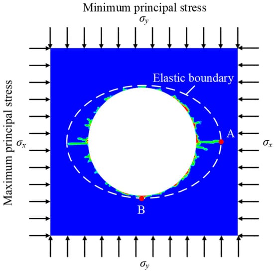 Distribution of the fractured zone caused by blasting under a non-hydrostatic in situ stress condition σx = 3σy = 30 MPa.