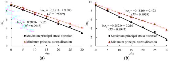 Regression analysis of seismic energy density attenuation with distance under non-hydrostatic in situ stress conditions: (a) σx = 2σy = 20 MPa; (b) σx = 3σy = 30 MPa.