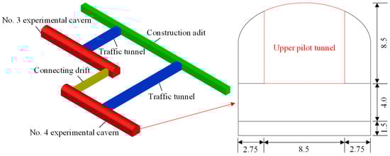The CJPL is mainly composed of experimental caverns, traffic tunnels, and connecting drifts, as presented in Figure 11. It is excavated underground at a depth exceeding 2000 m. The maximum principal in situ stress measured on-site exceeds 70 MPa. The rock mass in this project is mainly fresh and intact marble. The experimental caverns in the CJPL have a length of 130 m, a width of 14 m, and a height of 14 m. It is excavated in three layers by using the drilling and blasting method. During the excavation of the upper layer, a pilot tunnel measuring 8.5 m wide and 8.5 m high is first blasted, and then the two sides are followed. The bench blasting with vertical holes is employed in the middle layer. The lower layer is a protective layer, and the smooth blasting method with horizontal holes is used in the excavation of this layer.