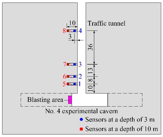 In order to monitor the blasting vibration within the rock mass, four instrument installment holes that are 10 m in length are drilled horizontally from the traffic tunnel wall into the surrounding rock mass, as shown in Figure 12. These holes are located almost at the same elevation, that is, 1.2 m above the traffic tunnel floor. The straight distance between the instrument installment holes and the experimental cavern wall varies from 10 to 67 m. Eight triaxial velocity sensors are installed in the instrument holes. Among them, Nos. 1–4 sensors are placed at a depth of 3 m from the traffic tunnel wall, and Nos. 5–8 sensors are fixed at a depth of 10 m from the traffic tunnel wall. The seismic wave signals collected by the velocity sensors are synchronously transmitted to the data loggers. In order to ensure the high-frequency seismic waves near the blasting source can be recorded, the sampling frequency of the data loggers is set to 10 kHz.