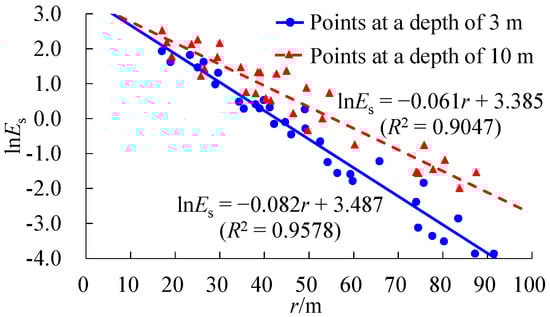 According to the measured velocity histories, the seismic energy versus distance on a logarithmic plot is shown in Figure 13. In this figure, the circular symbol represents the monitoring points at a depth of 3 m, and the triangular symbol denotes the monitoring points at a depth of 10 m. Their best fit straight lines are plotted by the solid blue line and red dashed line, respectively. Based on the regression analysis results, the seismic energy attenuation for the monitoring points at a depth of 3 m is: