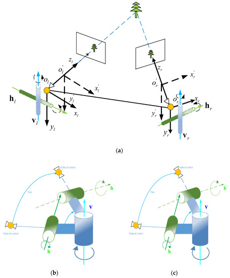 (a) General model for dual-PTZ cameras. (b) The pitching rotation axis is the driven axis. (c) The horizontal rotation axis is the driven axis.