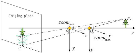 Because the optical center moves back and forth along the optical axis in the process of zooming, the optical center changes relative to the original position during the zooming process. However, the actual distance of the camera’s optical center changes by only a few millimeters, which can be ignored when high calibration accuracy is not required. A diagram of the change in the optical center caused by zooming is shown in Figure 6.