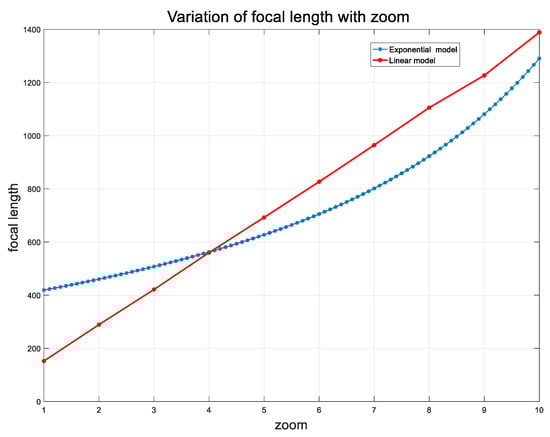 The focal length of the camera increases as zoom increases, but the variation trend and fitting model for focal length is different for different PTZ cameras (Figure 4). For the PTZ camera in Ref. [12], the variation rate of the focal length also increases as zoom increases, the variation trend of which we used as the exponential function model. In the case of Ref. [18], where the focal length is approximately linear with the zoom value, we used the linear interpolation method or a quadratic function to establish the function expression.