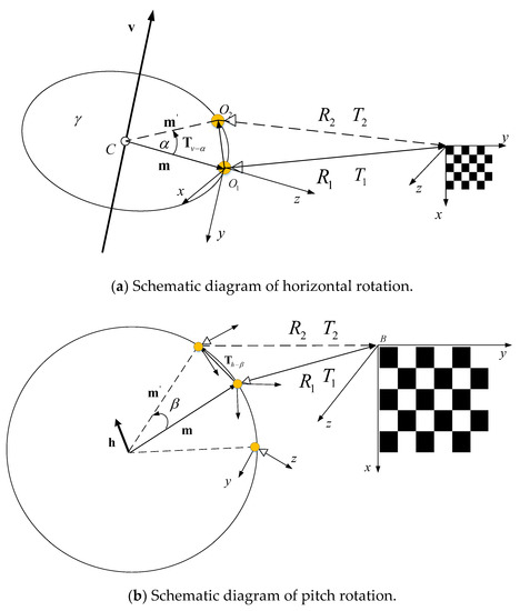 According to Expressions (19) and (21), for PTZ cameras conform to Figure 1b, when the horizontal rotation of the left and right cameras is degrees, the pitch rotation of the left and right cameras is β degrees, and the zoom value is z. The rotation and translation matrices of the camera coordinate system relative to its original position are: