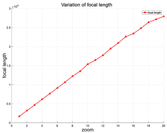 We took the camera focal length when the zoom value was 1, 2, ···· 19, 20, as with the previous calibration results; its variation trend is shown in Figure 7: