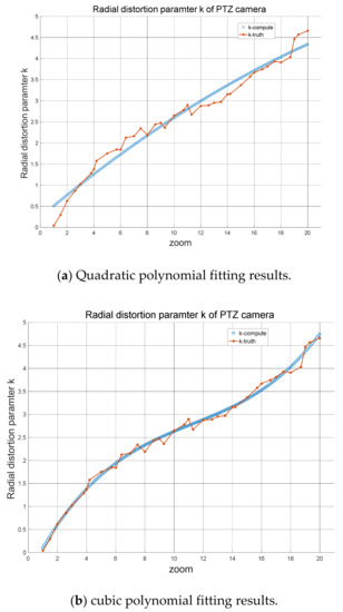 According to the previous calibration results, it can be seen that the overall variation trend of the camera’s radial distortion parameter, k, increases with an increase in focal length, but it is not strictly monotonic. We used the second-order polynomial and the third-order polynomial to establish the relationship between the distortion parameter, k, and the zoom value in Section 4.1, and we compared their fitting degree with the ground truth, calibrated by Zhang’s method.