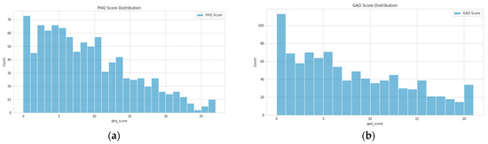 Distribution of scores for all participants included in the analysis: (a) PHQ-9 scores; (b) GAD-7 scores.