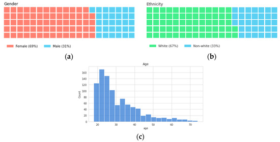 Distribution of participants by (a) gender, (b) ethnicity, and (c) age.
