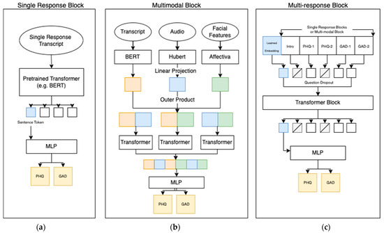 Model architecture of the final PHQ-V and GAD-V model consisting of three different parts: (a) A single response block which finely tuned a pre-trained transformer; (b) a multimodal block which combines multiple single response blocks using a self-attention transformer block; and (c) a multi-response block which combines multiple questions and uses a self-attention transformer combined with question dropout. The final PHQ/GAD layer shows that scores can be assessed at any of the three blocks, or the embeddings can be passed down to further blocks allowing comparison of scores at different levels of abstraction.