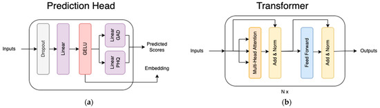 The structure of the two blocks used in the model: (a) The prediction head, which takes embeddings from upstream models and produces scores; (b) the transformer encoder block described in [9].