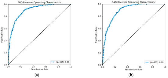Receiver operating characteristics curve for (a) PHQ-V predictions and (b) GAD-V predictions.