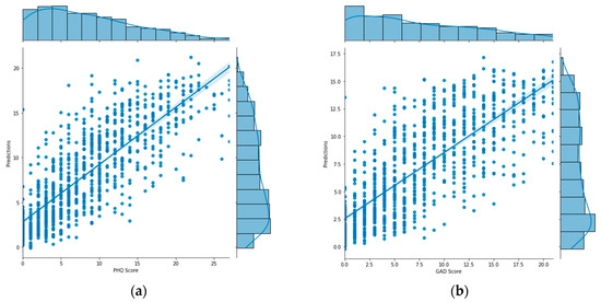 Graph of (a) PHQ-V predictions and (b) GAD-V predictions (right) compared with values calculated from the PHQ-9 and GAD-7 assessments.