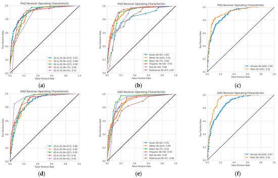 Receiver operating characteristic (ROC) curves for self-reported (a) age, (b) ethnicity, and (c) gender for PHQ-V predictions, and (d) age, (e) ethnicity, and (f) gender for GAD-V predictions.