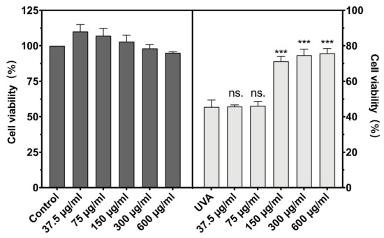 The cytotoxicity of BAL1 against CCC-ESF-1 and the protection of CCC-ESF-1 from UVA damage are shown in Figure 2. BAL1 had low toxicity and was non-lethal to cells in the concentration range of 37.5–300 µg/mL, with survival rates at and above 100%. After incubation of BAL1 at a UVA dose of 16 J/cm2, a significant protective effect of BAL1 at concentrations greater than 150 µg/mL was seen in terms of cell viability (p < 0.001), and its survival rate increased from 45.58% in the model group to more than 70%, significantly reducing the mortality of CCC-ESF-1 due to UVA damage. For subsequent experiments, 75.5, 150 and 300 µg/mL were used as concentrations to explore the functionality of BAL1.