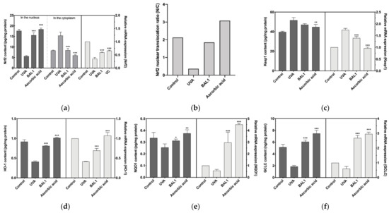 Effects of BAL1 on the conduction level of Nrf2/Keap1 signaling pathway. (a) Nuclear translocation of Nrf2 during signal transduction and its mRNA expression level. (b) The ratio of nuclear displacement of Nrf2. (c) The protein content of Keap1 and its mRNA expression level. (d) The protein content and mRNA expression level of the downstream regulatory gene HO-1. (e) The protein content and mRNA expression level of the downstream regulatory gene NQO1. (f) The protein content and mRNA expression level of the downstream regulatory gene GCLC. Difference analysis between sample group and UVA model group: *: p < 0.05, **: p < 0.01, ***: p < 0.001.