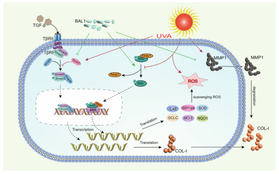The mRNA expression level and protein content of MMP-1 were significantly elevated after UVA stimulation of CCC-ESF-1, and the expression level of Smad7 was also considerably elevated. This shows that the elevated level of MMP1 promoted the catabolism of COL-I, while the negative regulation of TGF-β by Samd7 decreased the mRNA expression of COL-I. As shown in Figure 6, BAL1 promotes the repair of cells damaged by UVA irradiation mainly by increasing the mRNA expression of TGF-β and Smad2/3, and reducing the mRNA expression of Smad7. Moreover, to a certain extent, it also reduces the content of MMP-1 to avoid the degradation of COL-I.