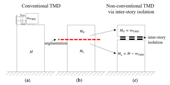 Recent studies have demonstrated that TMD control performances and robustness can be strongly enhanced by increasing its mass [2,3]. Research has proven inter-story isolation to be an effective method to achieve passive control of structural vibrations. The idea of applying partial isolation for original structures dates back to some decades ago [4,5]. The technique, compatible with applications on new buildings as well as retrofit interventions, consists of the insertion of isolators in the columns of multi-story buildings at floor level, resulting in the creation of a non-conventional TMD system, characterized by a high mass ratio without adding further structural masses (Figure 1b,c). Compared to traditional TMD devices, inter-story isolation ensures realization simplicity, minimum impact on target buildings, and contained construction and maintenance costs.