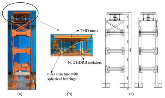 Configuration F4 is segmented into a three-story substructure and a one-story superstructure, which is converted into tuned mass (Table 1). A support plane, indicated with subscript “S”, is built on the top of the three-story frame and connected by two cross bracings in the motion direction in order to realize a rigid slab to place the isolators. The three-story structure with the support plane, named F3S, represents the second intermediate configuration tested, and it is indicated in Table 1, where the detail of the cross bracings and the rigid support plane are evidenced. The non-conventional TMD is realized by placing the one-story mass, which represents the superstructure, on two high damping rubber bearings (HDRB) placed in series, positioned in the center of the support plane (Figure 3b). The three-story structure with a rigid support plane controlled by the non-conventional TMD implemented via inter-story isolation, named FTMD, is the third configuration tested (Table 1, depicted in Figure 3a). It has total height of 2.48 m, floor masses m1 = m2 = 131 kg and m3 = 133 kg, a support plane mass mS = 17 kg, and a TMD mass mTMD = 100 kg. Model dimensions are reported in Figure 3c.