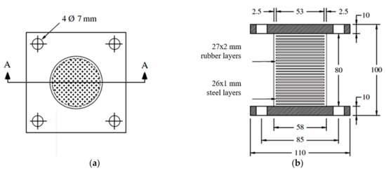 The HDRB isolators, realized according to the TMD design described in Section 3, consist of two bearings made by 27 layers, 2 mm thick, and 26 steel shims, 1 mm thick. The total rubber thickness is 54 mm, the height of the bearing is 80 mm, and the total diameter is 58 mm, including 53 mm of shim diameter and 5 mm of cover (Figure 4). A truss structure connected at the base of the support floor by four spherical bearings (see Figure 3b) is realized in order to avoid flexural behavior of the isolators, which sustain only shear strain. The threaded rods are braced in the direction of the motion.