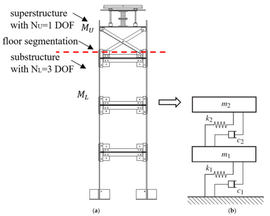 Given the four-degrees-of-freedom (DOF) frame structure, we model by taking the masses lumped at floor level and assuming purely translational motion. The isolation system located below the fourth floor segments the four-story frame structure into a lower (L) portion, also denominated as substructure, and an isolated upper (U) portion, also denominated as superstructure, corresponding to a number of DOF indicated as NL = 3 and NU = 1 DOF, respectively (see in Figure 5a). With reference to this physical model, it is possible to utilize a reduced-order 2-DOF model for design purposes (Figure 5b): the first DOF with mass , stiffness , and damping , represents the generalized primary structure, F3S configuration (Table 1), and the second one represents the non-conventional TMD with mass , stiffness , and damping .