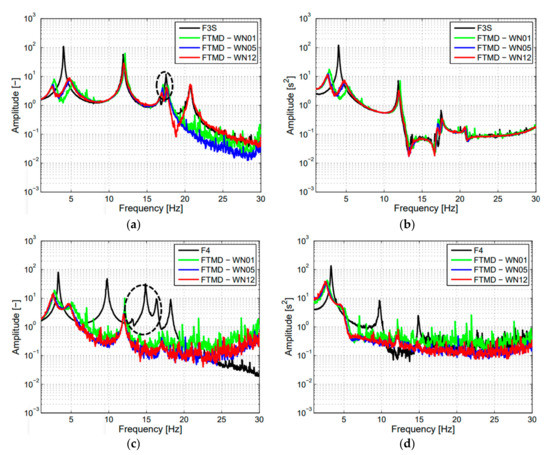 WN. Frequency response functions: (a) absolute acceleration at support plane, (b) relative displacement at support plane, (c) 4th floor absolute acceleration, (d) 4th floor relative displacement. Legend: F3S, F4, FTMD configurations at RMS amplitudes WN01 = 0.002 g, WN05 = 0.008 g, WN12 = 0.025 g. Circles in the figure indicate additional modes due to asymmetric base boundary conditions.