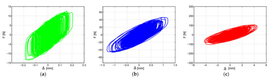 Figure 9 reports the force displacement cycles of the isolators in the FTMD configuration at the three input intensities investigated. It can be noticed that at low intensity the isolators behave as rigid plastic elements, the friction effects being predominant due to the interaction with the support plane. Instead, at higher intensities the cycles become elliptic, denoting that most of the damping is due to viscous effects. Moreover, it is possible to observe that the effective stiffness of the isolators decreases by increasing the input intensity. From the force displacement cycles, the secant stiffness of the isolators in the range of displacements considered ranges from 75 kN/m (Figure 9a) to 25 kN/m (Figure 9c).