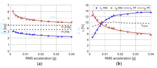 (a) First two identified frequencies for FTMD configuration versus the RMS of the base excitation (experimental values and interpolating curves), dotted lines: first frequency of F3S and F4 configuration, respectively, (b) first two identified damping factors for FTMD configuration versus the RMS of the base excitation (experimental values and interpolating curves), dotted line: mean value of the first two identified damping factors versus the RMS of the base excitation.